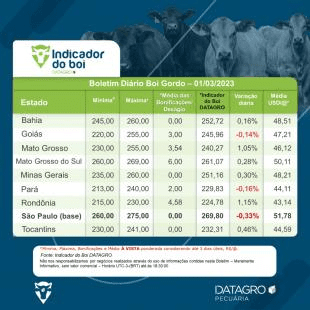 No Indicador, você também encontra os preços para as praças de Minas Gerais, Goiás, Mato Grosso do Sul, Mato Grosso, Rondônia, Bahia, Pará e Tocantins.