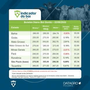 No Indicador, você também encontra os preços para as praças de Minas Gerais, Goiás, Mato Grosso do Sul, Mato Grosso, Rondônia, Bahia, Pará e Tocantins.