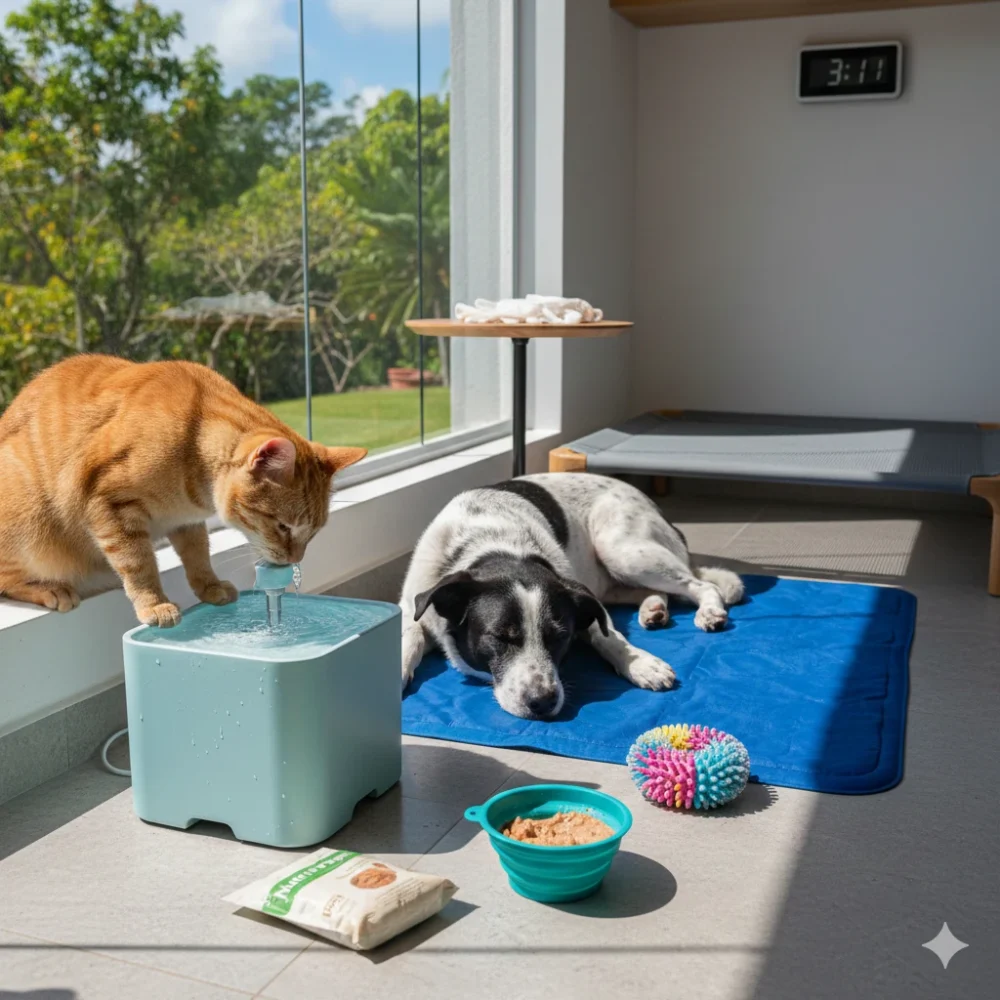 A hidratação é, sem dúvida, o pilar mais importante da sobrevivência no calor. No caso dos cães, levar água fresca durante os passeios é obrigatório. Potes retráteis e garrafas portáteis facilitam essa missão. Já para os gatos, o desafio é o interesse pela água. Os felinos, por natureza, preferem água corrente e fresca. Investir em fontes de cerâmica ajuda a manter o líquido em movimento e em uma temperatura agradável por muito mais tempo.