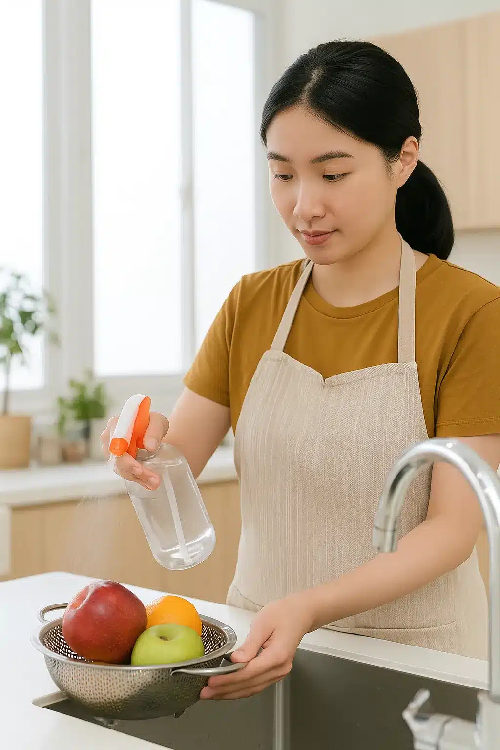 Você pode colocar a mistura em um borrifador e aplicar direto em frutas e vegetais firmes, como maçãs e pepinos. Praticidade e segurança em segundos!