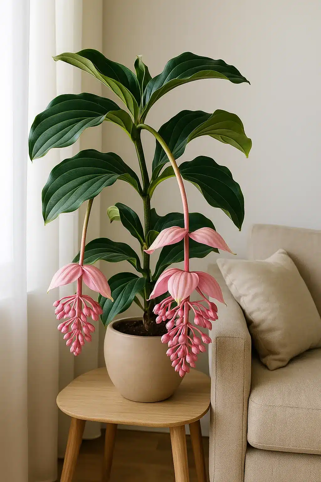 Combine a Medinilla magnifica com móveis de madeira clara ou superfícies neutras para criar contraste visual e valorizar suas cores vibrantes.