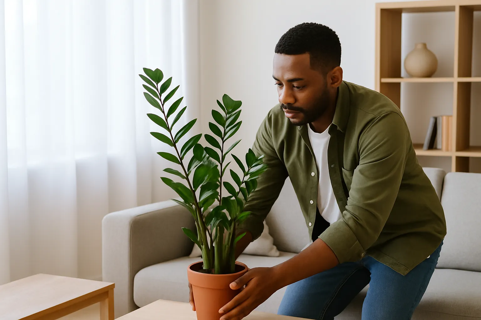 A zamioculca é conhecida por tolerar ambientes pouco iluminados, mas isso não significa que ela goste disso. Para realmente bombar, ela precisa de luz indireta abundante — aquela claridade boa que entra pela janela, mas sem sol direto queimando as folhas. Um canto de sala iluminado, perto de uma janela com cortina fina, ou mesmo o centro de um cômodo claro costuma ser o ponto ideal.